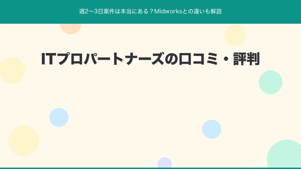 この記事で分かること: ITプロパートナーズの口コミ・評判を調査。週2〜3日の副業・複業案件に強いエージェントの実態、メリット・デメリット、Midworksとの違いをフリーランスエンジニアの視点でまとめました。